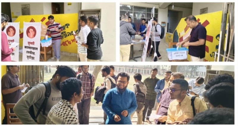 দেশে প্রথমবার ক্যাম্পাসভিত্তিক এই প্রতীকী গণভোট জুলাই সনদ বাস্তবায়নে গণভোট ২০২৬ নিয়ে জনমত গঠন ও গণতান্ত্রিক সচেতনতা তৈরিতে একটি ব্যতিক্রমী উদ্যোগ হিসেবে দেখছেন সংশ্লিষ্টরা।