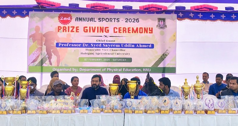 হবিগঞ্জ কৃষি বিশ্ববিদ্যালয়ে শনিবার (৭ ফেব্রুয়ারি) বিশ্ববিদ্যালয়ের অস্থায়ী খেলার মাঠে সকাল ৯টায় বিপুল উৎসাহ ও উদ্দীপনার মধ্য দিয়ে শুরু হয় বার্ষিক ক্রীড়া উৎসব। এ আয়োজন শিক্ষার্থী, শিক্ষক ও কর্মকর্তা-কর্মচারীদের একত্রিত করে প্রতিযোগিতার রোমাঞ্চ ও উদযাপনের আনন্দে ভরিয়ে তোলে পুরো দিনটি। দিনব্যাপী নানা ধরনের উত্তেজনাপূর্ণ ক্রীড়া প্রতিযোগিতার মাধ্যমে অংশগ্রহণকারীরা তাদের ক্রীড়া নৈপুণ্য ও দলগত চেতনার পরিচয় দেন। রোমাঞ্চকর দৌড় প্রতিযোগিতা থেকে শুরু করে প্রাণবন্ত দলীয় খেলায় মাঠজুড়ে ছিল উচ্ছ্বাস ও করতালি। পবিত্র কোরআন থেকে তিলাওয়াতের মাধ্যমে অনুষ্ঠানের শুভ সূচনা করা হয়। অনুষ্ঠানে প্রধান অতিথি হিসেবে উপস্থিত ছিলেন বিশ্ববিদ্যালয়ের উপাচার্য অধ্যাপক ড. সৈয়দ সায়েম উদ্দিন আহম্মদ। তাঁর অনুপ্রেরণামূলক বক্তব্য উপস্থিত সকলের মধ্যে ব্যাপক সাড়া ফেলে এবং বিশ্ববিদ্যালয়ে ঐক্য ও সৌহার্দ্য গড়ে তুলতে এমন আয়োজনের প্রয়োজনীয়তা তুলে ধরে। খেলাধুলা শেষে অনুষ্ঠিত হয় বহুল প্রতীক্ষিত পুরস্কার বিতরণী অনুষ্ঠান। দিনব্যাপী প্রতিযোগিতায় অসাধারণ পারফরম্যান্স প্রদর্শনকারী বিজয়ীদের হাতে পুরস্কার ও সম্মাননা তুলে দেন বিশ্ববিদ্যালয়ের উপাচার্য। বিজয়ীদের সম্মানিত করার সময় পুরো পরিবেশ হয়ে ওঠে আনন্দ, গর্ব ও উচ্ছ্বাসে পরিপূর্ণ।