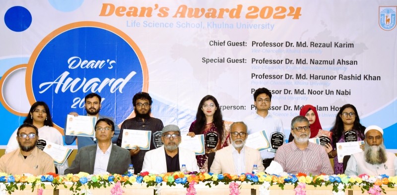 মেধা ও একাডেমিক কৃতিত্বের স্বীকৃতিস্বরূপ খুলনা বিশ্ববিদ্যালয়ের জীব বিজ্ঞান স্কুলভুক্ত সাতটি ডিসিপ্লিনের সাতজন শিক্ষার্থী ডিন’স অ্যাওয়ার্ড লাভ করেছেন। গত (৯ ফেব্রুয়ারি) সোমবার বিকাল ৩টায় বিশ্ববিদ্যালয়ের সাংবাদিক লিয়াকত আলী মিলনায়তনে আয়োজিত এক অনুষ্ঠানে অ্যাওয়ার্ডপ্রাপ্ত শিক্ষার্থীদের হাতে ক্রেস্ট ও সম্মাননাপত্র তুলে দেওয়া হয়।