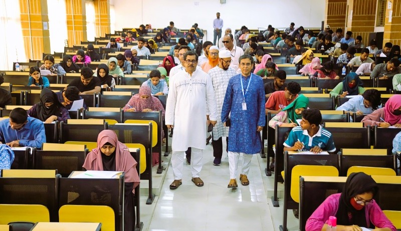 উপাচার্য অধ্যাপক ড. মোঃ আব্দুল মজিদ বিশ্ববিদ্যালয়ের কোষাধ্যক্ষ অধ্যাপক ড. হোসেন আল মামুনকে সঙ্গে নিয়ে বিভিন্ন পরীক্ষার হল পরিদর্শন করেন। ছবি : ক্যাম্পাস রিপোর্ট