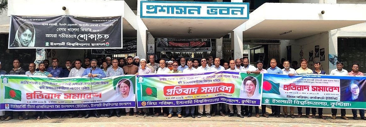 ইসলামী বিশ্ববিদ্যালয় (ইবি) ক্যাম্পাসে জাতীয় পতাকা ও সাবেক প্রধানমন্ত্রী খালেদা জিয়া-র ছবি অবমাননার অভিযোগকে কেন্দ্র করে বিক্ষোভ সমাবেশ করেছে বিএনপিপন্থি শিক্ষক-কর্মচারীরা। রবিবার (১৯ এপ্রিল) দুপুরে বিশ্ববিদ্যালয়ের প্রশাসন ভবনের সামনে এ কর্মসূচি পালিত হয়। একইসঙ্গে ঘটনাটি তদন্তে পাঁচ সদস্যের একটি কমিটি গঠন করেছে বিশ্ববিদ্যালয় প্রশাসন।