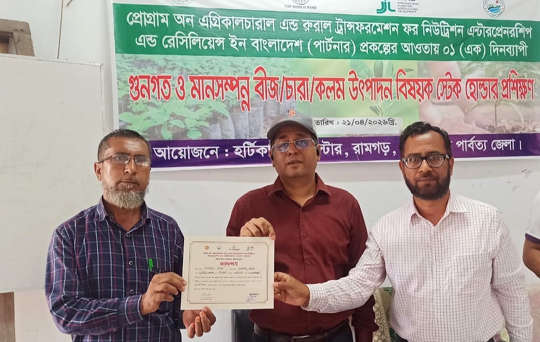 মঙ্গলবার (২১ এপ্রিল) প্রোগ্রাম অব এগ্রিকালচারাল অ্যান্ড রুরাল ট্রান্সফরমেশন ফর নিউট্রিশন, এন্টারপ্রেনারশিপ অ্যান্ড রেজিলিয়েন্স ইন বাংলাদেশ (পার্টনার) প্রকল্পের আওতায় রামগড় হর্টিকালচার সেন্টারের হলরুমে এ প্রশিক্ষণের আয়োজন করা হয়।