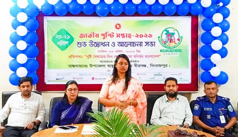 দিনাজপুরের বীরগঞ্জে জাতীয় পুষ্টি সপ্তাহ-২০২৬ উপলক্ষে বর্ণাঢ্য আয়োজনে শুভ উদ্বোধন ও আলোচনা সভা অনুষ্ঠিত হয়েছে। বৃহস্পতিবার (২৩ এপ্রিল) উপজেলা স্বাস্থ্য কমপ্লেক্স মিলনায়তনে এ কর্মসূচি অনুষ্ঠিত হয়।