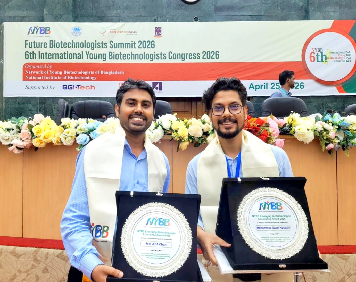 ঢাকা বিশ্ববিদ্যালয়ে আয়োজিত আন্তর্জাতিক DNA দিবস উপলক্ষে অনুষ্ঠিত ফিউচার বায়োটেক সামিট এবং ষষ্ঠ আন্তর্জাতিক ইয়াং বায়োটেকনোলজিস্টস কংগ্রেস ২০২৬ এ দেশের সেরা এক্সিলেন্স অ্যাওয়ার্ড অর্জন করেছেন মাওলানা ভাসানী বিজ্ঞান ও প্রযুক্তি বিশ্ববিদ্যালয়ের (মাভাবিপ্রবি) দুই সাবেক শিক্ষার্থী।