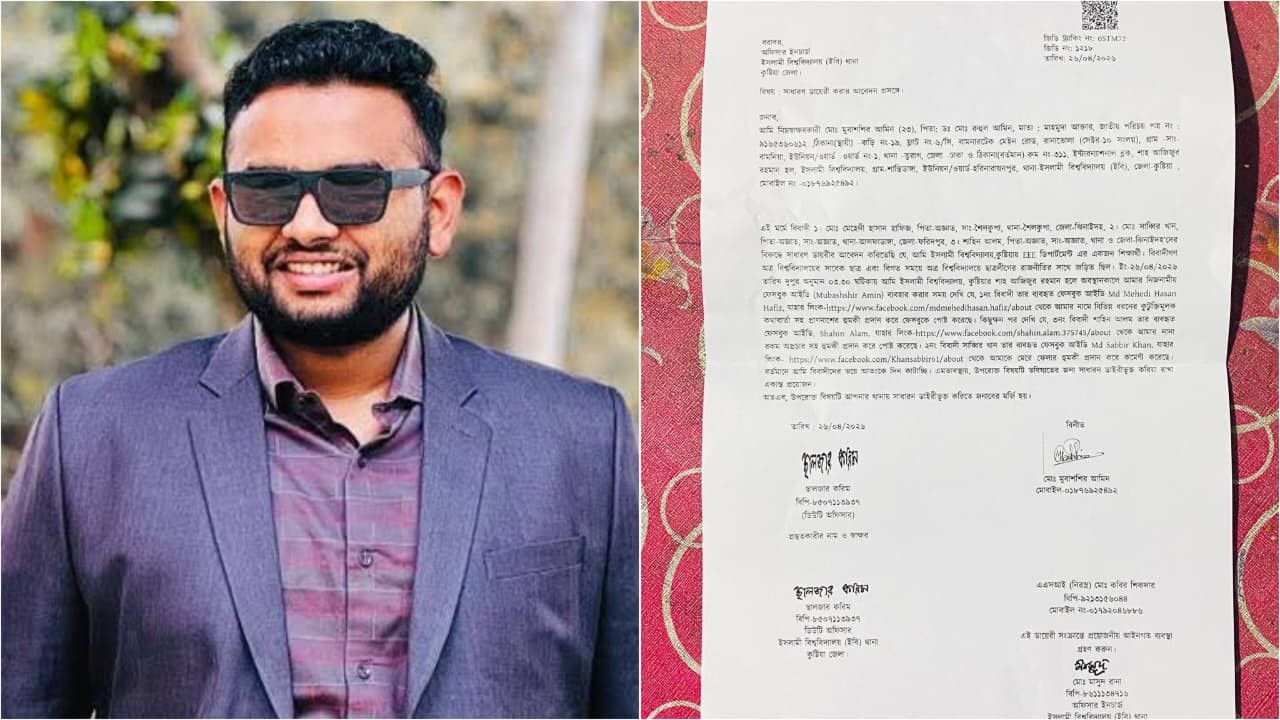 সোমবার (২৭ এপ্রিল) তিনি ইবি থানায় এ জিডি দায়ের করেন। মুবাশ্বির আমিন বিশ্ববিদ্যালয়ের ইলেকট্রিক্যাল অ্যান্ড ইলেকট্রনিক ইঞ্জিনিয়ারিং (ইইই) বিভাগের ২০২০-২১ শিক্ষাবর্ষের শিক্ষার্থী এবং শাহ আজিজুর রহমান হলের আবাসিক শিক্ষার্থী।