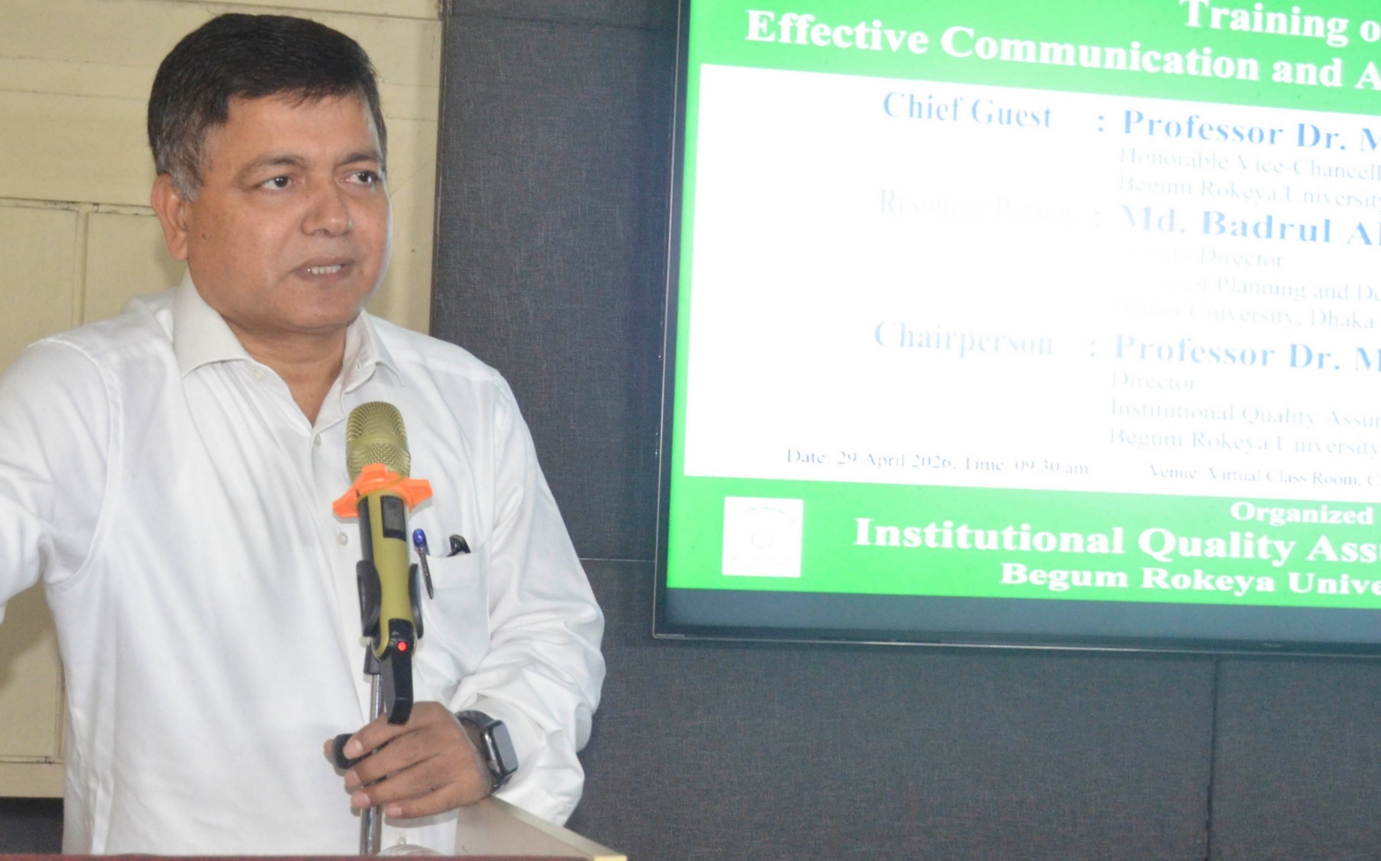 বেগম রোকেয়া বিশ্ববিদ্যালয়ে (বেরোবি) প্রশাসনিক কার্যক্রমের দক্ষতা বৃদ্ধি ও সেবার মানোন্নয়ন লক্ষ্যে “Effective Communication and Administrative Services” শীর্ষক এক প্রশিক্ষণ কর্মসূচি অনুষ্ঠিত হয়েছে। বিশ্ববিদ্যালয়ের ইনস্টিটিউশনাল কোয়ালিটি অ্যাসিউরেন্স সেল (আইকিউএসি)-এর উদ্যোগে বুধবার (২৯ এপ্রিল ২০২৬) সকালে একাডেমিক ভবন-২ এর কম্পিউটার সায়েন্স অ্যান্ড ইঞ্জিনিয়ারিং বিভাগের ভার্চুয়াল ক্লাসরুমে এ কর্মসূচি অনুষ্ঠিত হয়।