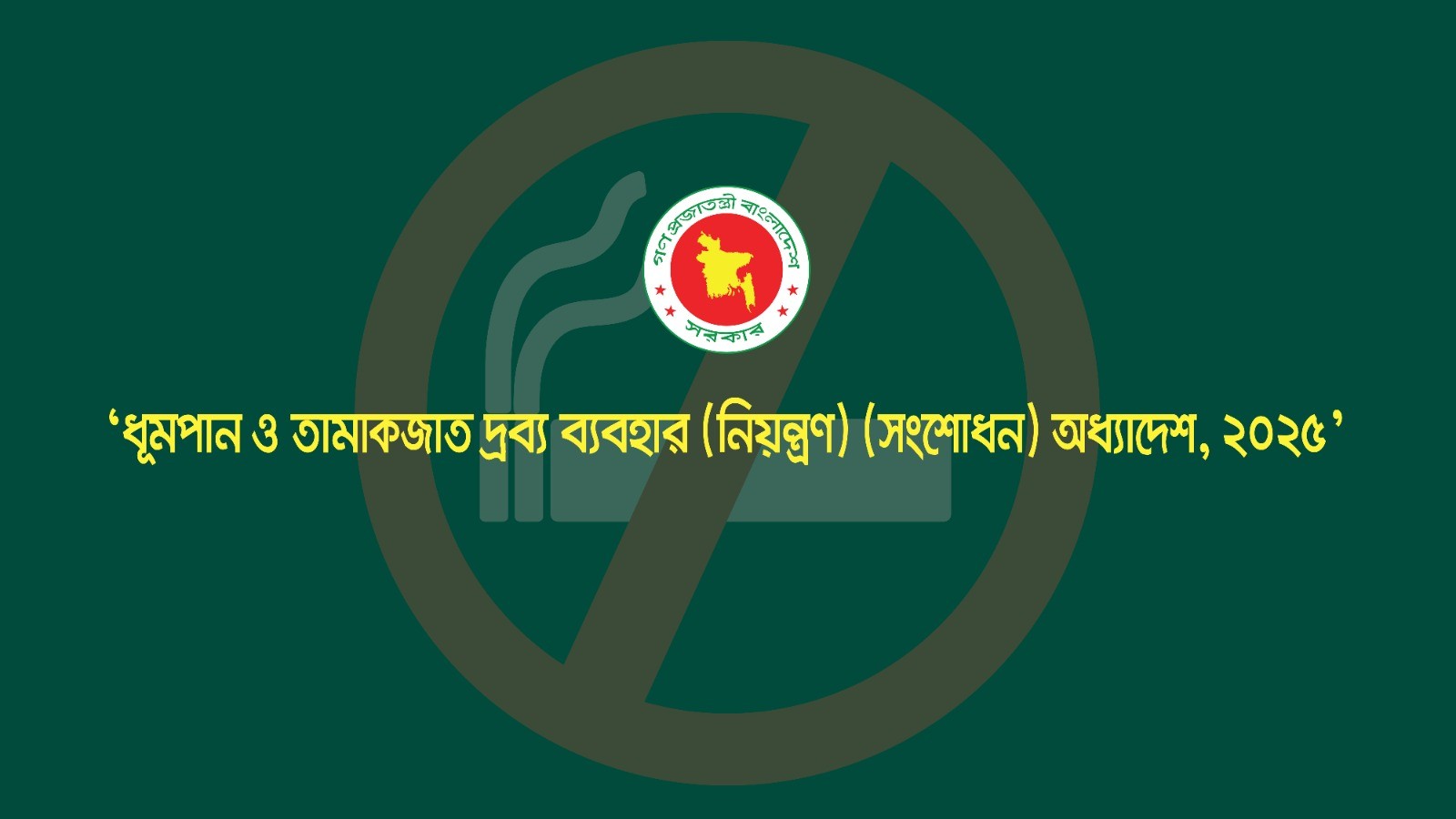 উপদেষ্টা পরিষদের সর্বশেষ বৈঠকে (২৪ ডিসেম্বর) স্বাস্থ্য সেবা বিভাগ, স্বাস্থ্য ও পরিবার কল্যাণ মন্ত্রণালয় কর্তৃক প্রস্তাবিত ‘ধূমপান ও তামাকজাত দ্রব্য ব্যবহার (নিয়ন্ত্রণ) (সংশোধন) অধ্যাদেশ, ২০২৫’ অনুমোদিত হয়েছে। অনুমোদিত অধ্যাদেশে ইমার্জিং টোব্যাকো প্রডাক্টস—যেমন ই-সিগারেট (e-cigarette) বা ইলেকট্রনিক নিকোটিন ডেলিভারি সিস্টেম (ENDS), হিটেড টোব্যাকো প্রডাক্ট (HTP) ইত্যাদির ব্যবহার, উৎপাদন ও বিপণন নিষিদ্ধ করার প্রস্তাব করা হয়েছে; ‘তামাকজাত দ্রব্য’-এর সংজ্ঞার আওতায় নিকোটিন পাউচ (Nicotine Pouch) অন্তর্ভুক্ত করা হয়েছে; পাবলিক প্লেস ও পাবলিক পরিবহণে ধূমপানের পাশাপাশি সকল প্রকার তামাকজাত দ্রব্যের ব্যবহার নিষিদ্ধ করা হয়েছে। একই সঙ্গে ধূমপানের জন্য নির্ধারিত স্থান (Designated Smoking Area-DSA) রাখার বিধান সরকারের নির্দেশনার শর্তাধীন করা হয়েছে; ‘পাবলিক প্লেস’ ও ‘পাবলিক পরিবহণ’ -এর সংজ্ঞা ও অধিক্ষেত্র সম্প্রসারণ করা হয়েছে; বিক্রয়স্থলে তামাকজাত দ্রব্যের প্রদর্শনসহ ইন্টারনেট বা অন্য যেকোনো মাধ্যমে তামাকজাত দ্রব্যের সকল প্রকার বিজ্ঞাপন, প্রচার ও প্রসার নিষিদ্ধ করা হয়েছে; এবং তামাকজাত দ্রব্যের প্যাকেটের গায়ে বিদ্যমান ৫০ শতাংশের পরিবর্তে ৭৫ শতাংশ এলাকা জুড়ে স্বাস্থ্য সম্পর্কিত সতর্কবাণী মুদ্রণের বিধান সংযোজন করা হয়েছে।