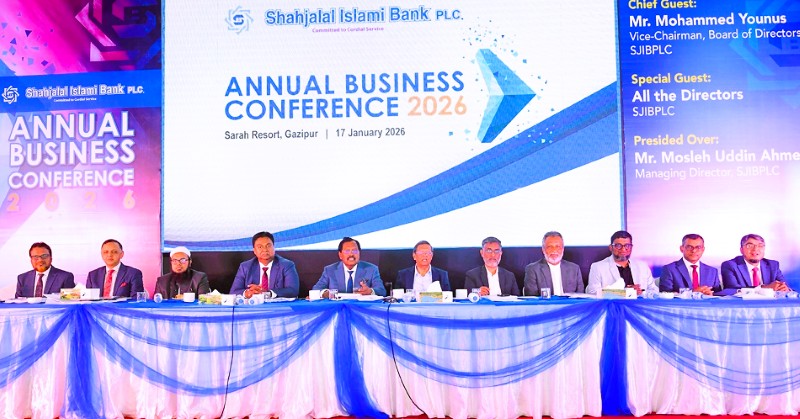 শাহজালাল ইসলামী ব্যাংক পিএলসির “বার্ষিক ব্যবসায়িক সম্মেলন-২০২৬” গতকাল শনিবার গাজীপুরের এক রিসোর্টে অনুষ্ঠিত হয়। ব্যাংকের ব্যবস্থাপনা পরিচালক মোসলেহ উদ্দীন আহমেদের সভাপতিত্বে অনুষ্ঠিত সম্মেলনে শাহ্জালাল ইসলামী ব্যাংকের পরিচালক পর্ষদের ভাইস-চেয়ারম্যান মোহাম্মদ ইউনুছ প্রধান অতিথি হিসেবে উপস্থিত ছিলেন।